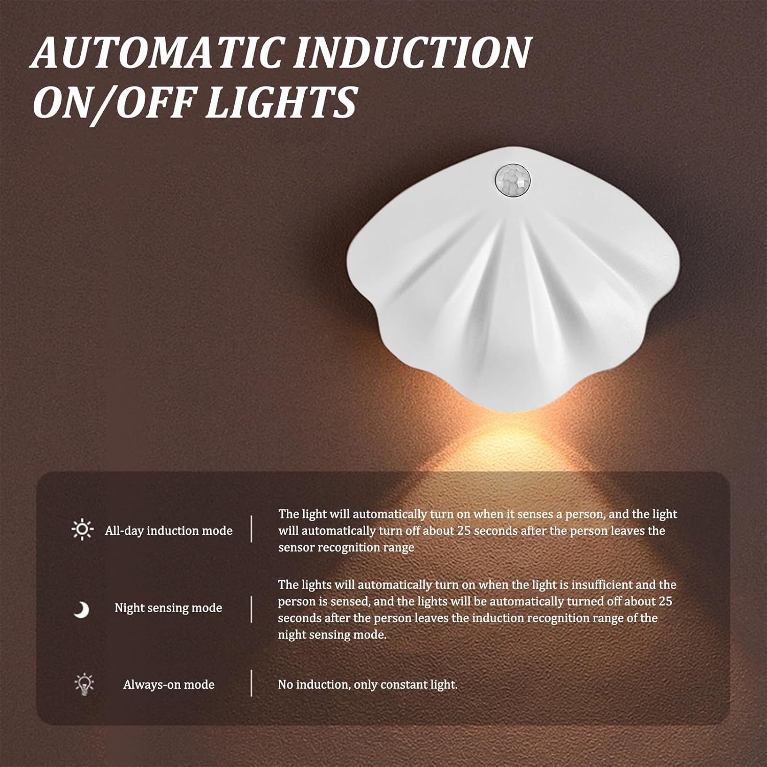 ✔️ 3 modes flexibles : AUTO (détection), ON (éclairage continu), OFF |