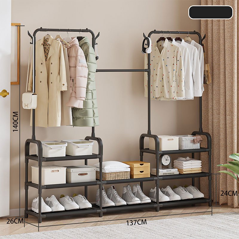 ✔️ Double barre de suspension pour manteaux, chemises et vestes | ✔️ Étagères inférieures multi-niveaux pour ranger chaussures et boîtes | ✔️ Crochets latéraux pratiques pour sacs, chapeaux et accessoires | ✔️ Structure métallique renforcée pour une stabilité durable | ✔️ Grande capacité de rangement pour optimiser l’espace | ✔️ Design moderne idéal pour chambre, entrée ou couloir | ✔️ Solution 2 en 1 pour organiser vêtements et chaussures facilement |