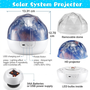 ✔️ Projection 360° immersive avec rotation fluide | ✔️ 5 films interchangeables sur le système solaire | ✔️ Lumière douce idéale comme veilleuse pour enfants | ✔️ Stimule l’imagination et la curiosité scientifique | ✔️ Mode silencieux pour un sommeil paisible | ✔️ Design compact et facile à utiliser | ✔️ Parfait pour chambre d’enfant et décoration | ✔️ Idée cadeau éducative et ludique |