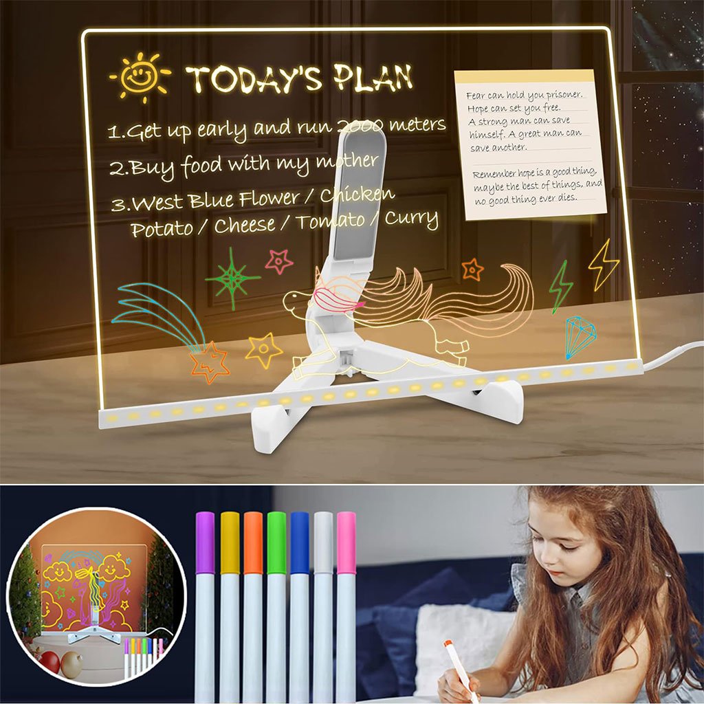 Tableau mémo LED avec stylo 7 couleurs et support LED lumineux avec stylo 7 couleurs et support